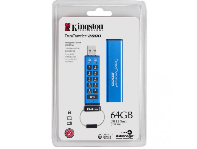 USB флеш накопители Kingston 64GB DT 2000 Metal Security USB 3.0 (DT2000/64GB) - это защищенные накопители с алфавитно-цифровой клавиатурой, блокирующие доступ к данным с помощью PIN-кода, представляющего собой число или слово. Функция автоматической блокировки включается при извлечении накопителя из устройства и удаляет ключ шифрования после 10 попыток взлома.