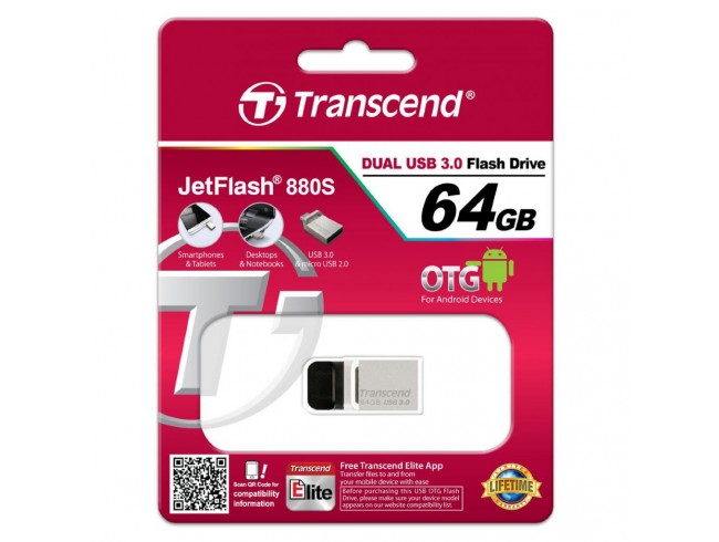 USB флеш накопитель Transcend 64GB JetFlash OTG 880 Metal Silver USB 3.0 (TS64GJF880S) отличается небольшой массой и выполнен в стильном и компактном эргономичном металлическом корпусе. Хоть эта флешка и имеет небольшой размер, ее максимальная емкость составляет 64 ГБ. Кроме того, благодаря технологии производства COB (Chip on Board) накопитель полностью пыле- и влагонепроницаемый и отличается высоким уровнем надежности. Бесплатное приложение Transcend Elite, которое доступно для загрузки на сайте компании, позволит просматривать содержимое накопителя, а также осуществлять резервное копирование фотографий, видеозаписей, документов и другого ценного для пользователя цифрового контента, который хранится в памяти смартфона или планшета.